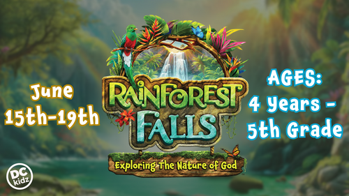 Step through the mist into Rainforest Falls, overflowing with wild waterfalls, towering trees, and colorful creatures. Beneath a canopy of chattering birds and howling monkeys, kids plunge into a lifelong adventure of discovering the nature of God. They’ll explore what it means to be rooted in relationship with God, their creator, a safe place in life’s storms. This event is open to kids ages 4 years old to 5th grade.